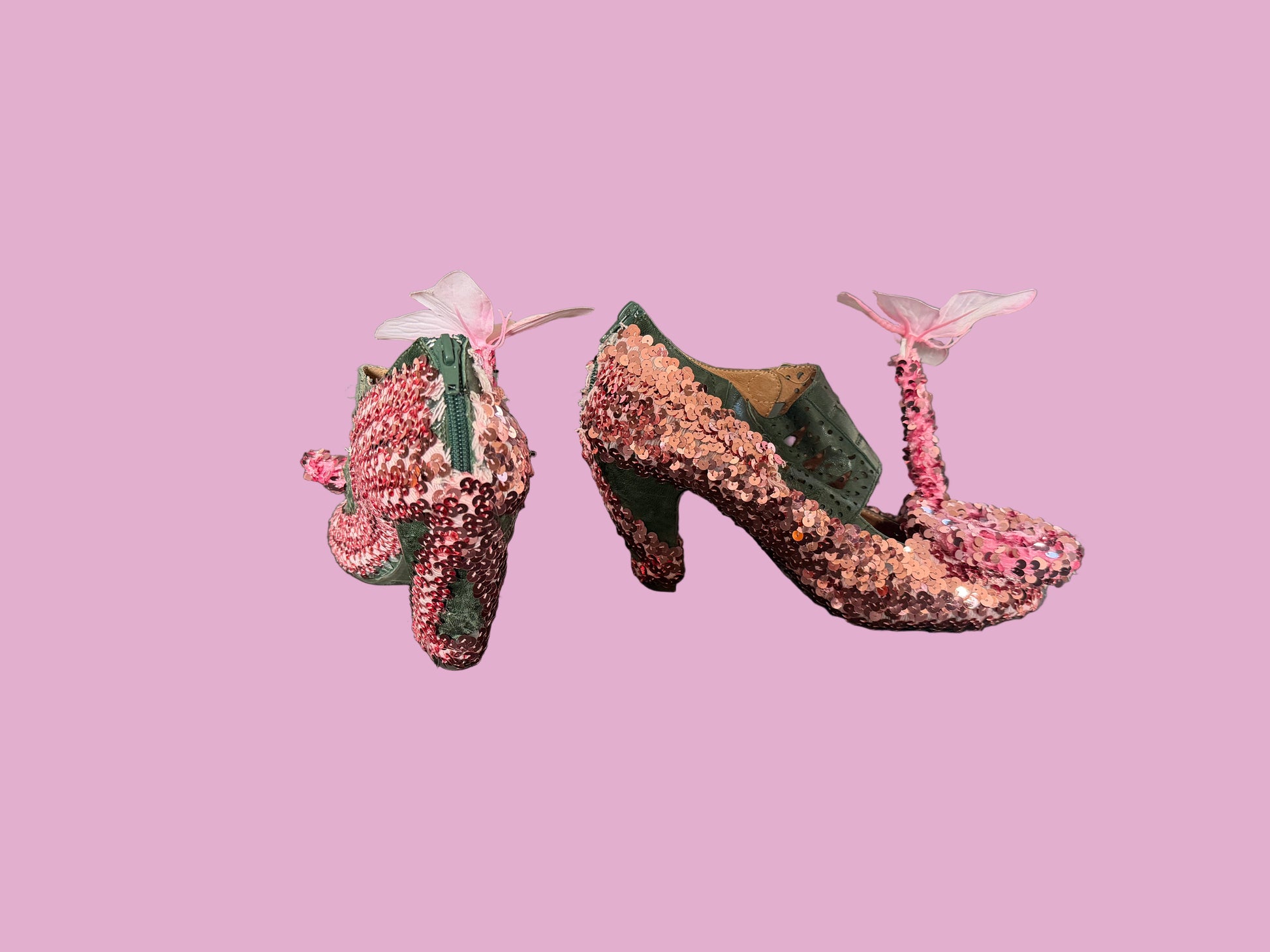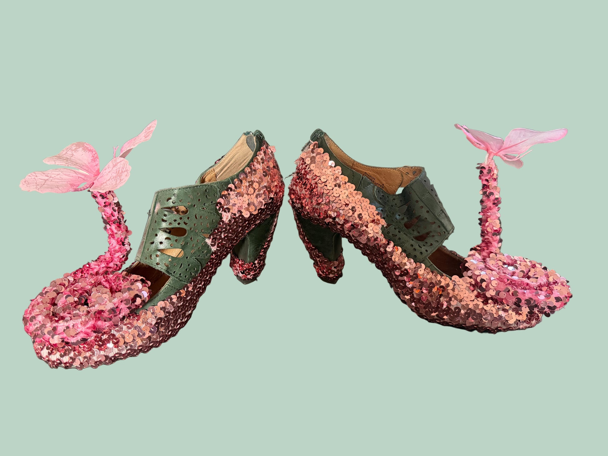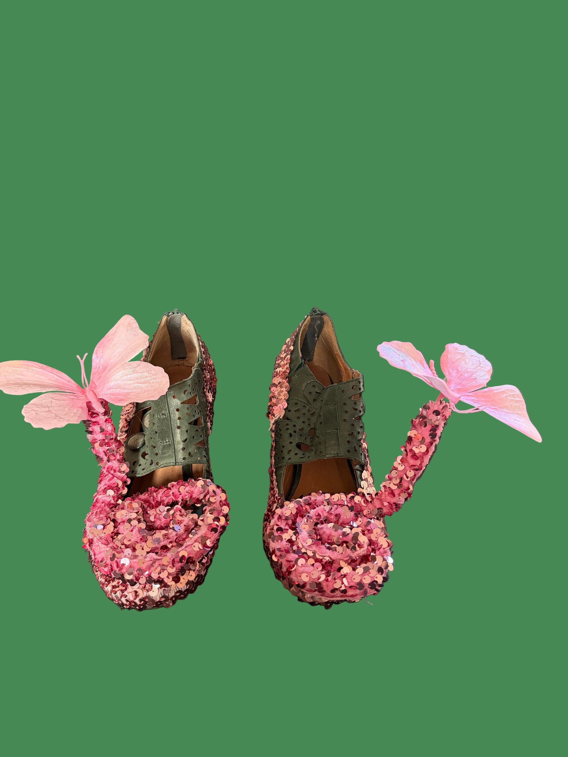These shimmering, hand-adorned heels transform every step into a small act of awakening. Covered in pink sequins that catch the light, the shoes feel alive—dancing with movement even at rest. Delicate pink butterflies rise from each heel, symbolizing the moment the inner self lifts, opens, and begins again.